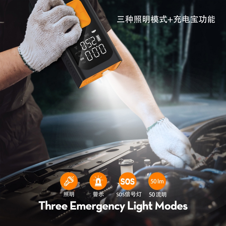 【液晶屏和LED灯】为了满足夜间的工作和紧急情况,电动气泵配备了LED灯。可用于照明或作为遇险信号。LED屏可以轻松设置所需的压力值或模式。