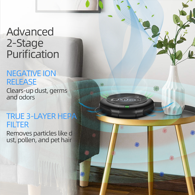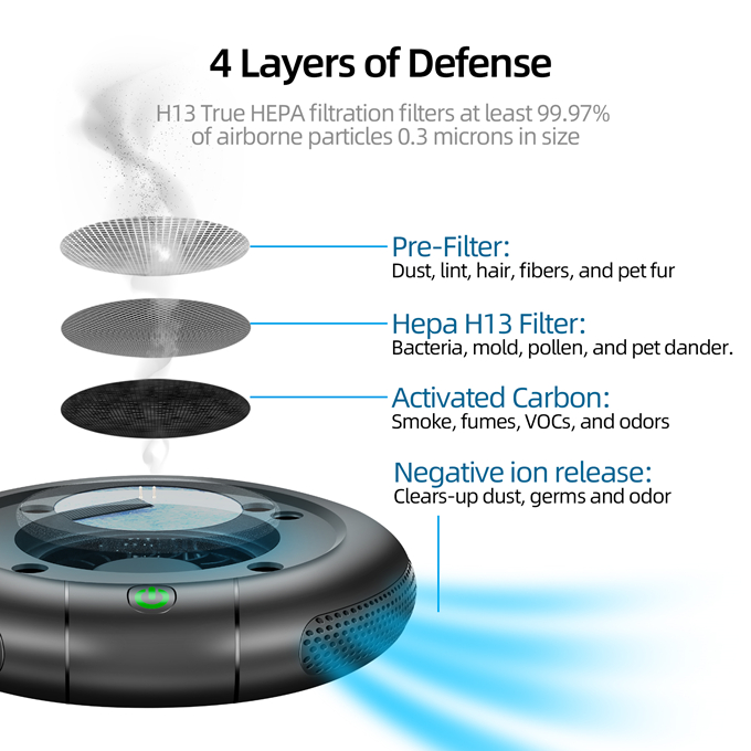 4-STAGE AIR PURIFICATION: Clean your personal air from 99.97% of dust, pollen, pet dander, smoke, and odors. Stage 1: Pre-Filter; Stage 2: True HEPA filter; Stage 3:Activated carbon pre-filter; Stage 4: Negative ion release.