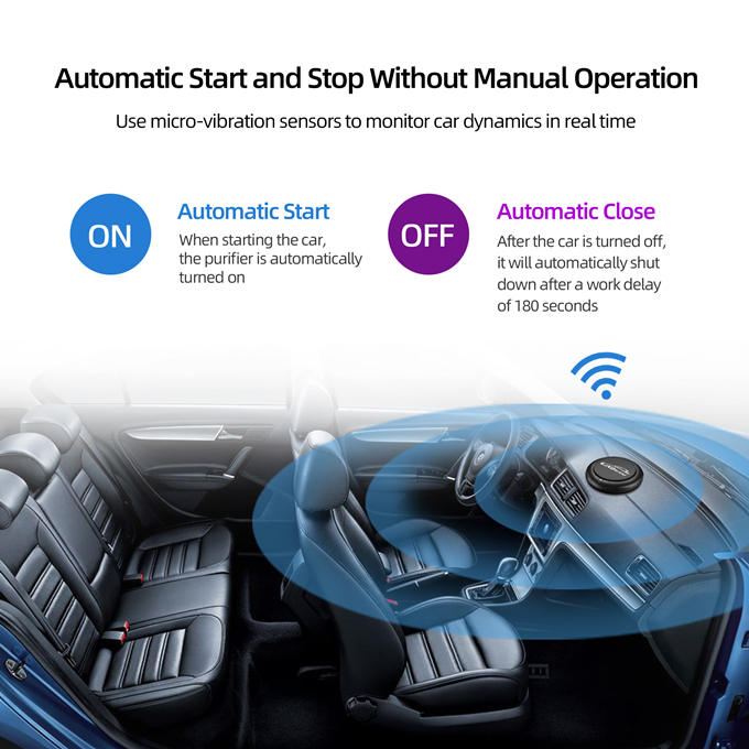 AUTO SHOT OFF/ ON: This purifier can sense vibration, it will also turn off when you turn off the car, and it will turn on automatically when the car is driving, no need to turn it on manually.