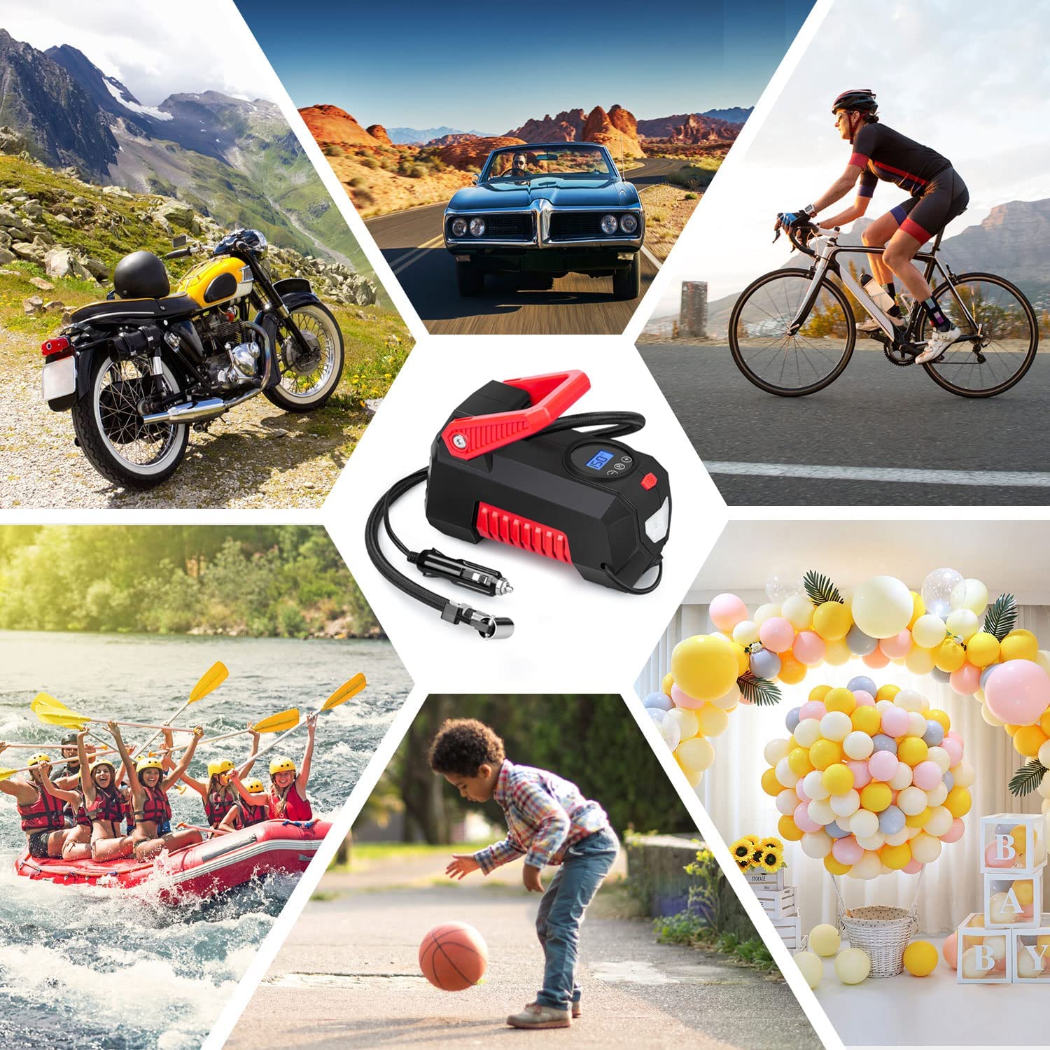 【Multi-Application】Manusage car tire inflator with emergency LED light ensure your use in darkness. 4-nozzles and extra fuse are included to meet different inflation demands.The portable compressor can inflate the tires of cars, motorcycle by schrader valve connection. And inflate balloons, basketball, swimming ring, air pillows, mattresses for outdoor activities by accessories nozzles.