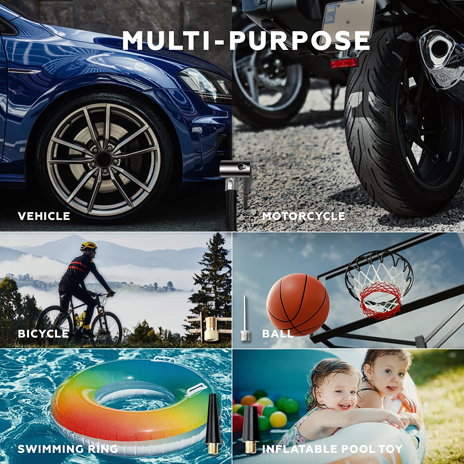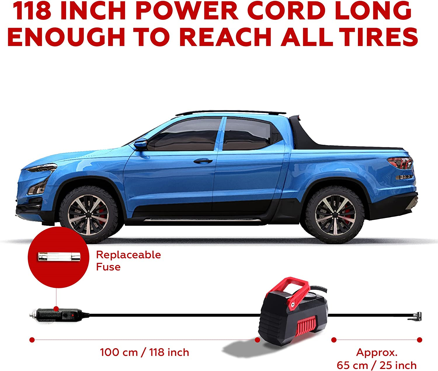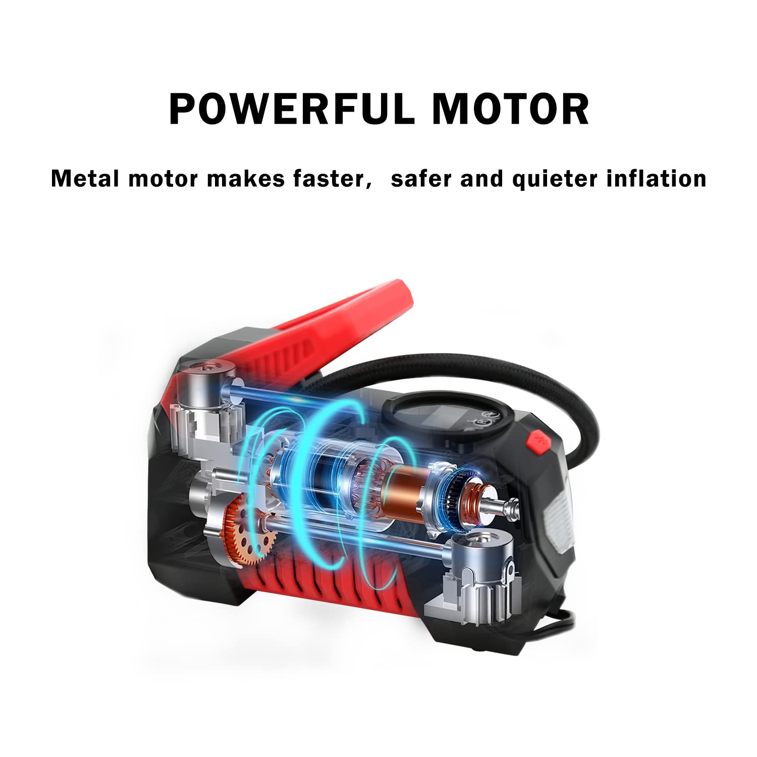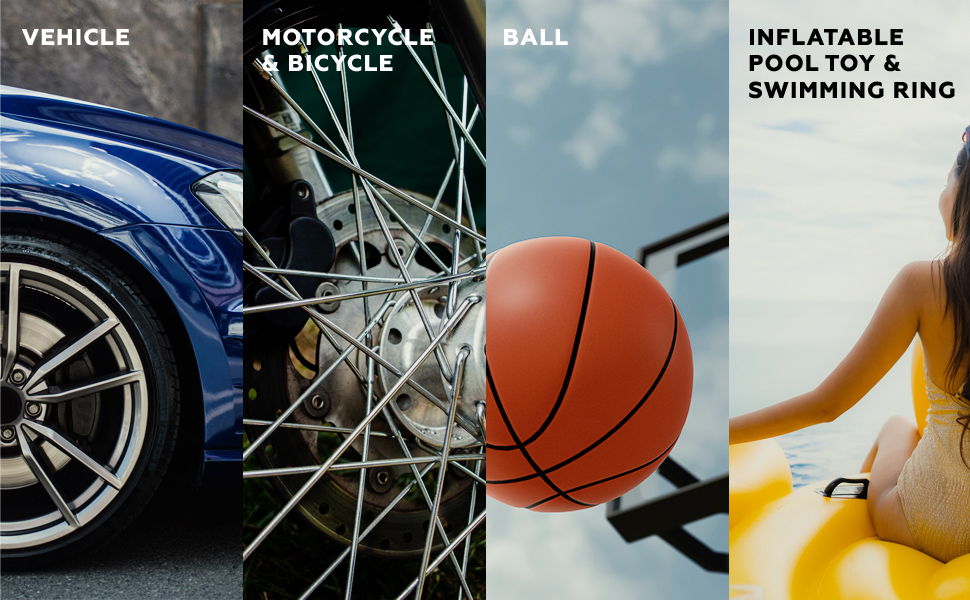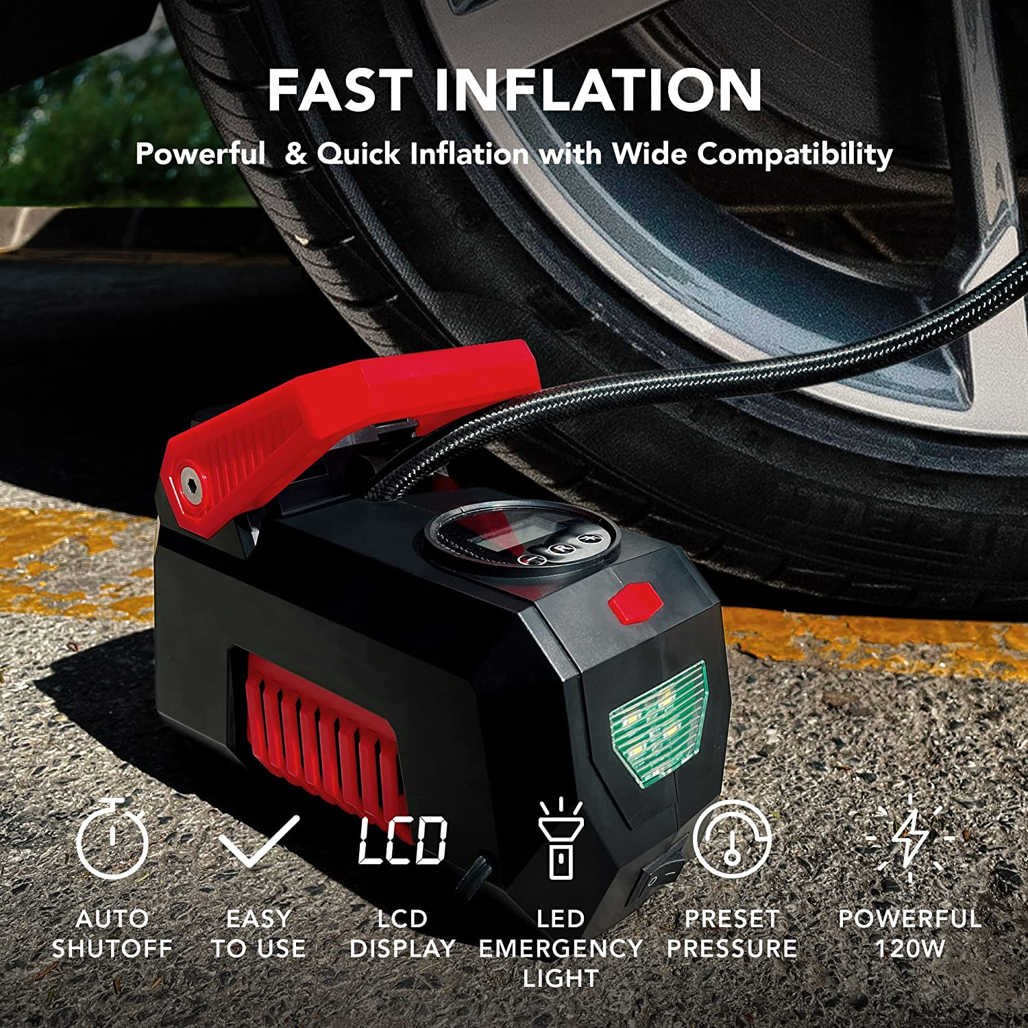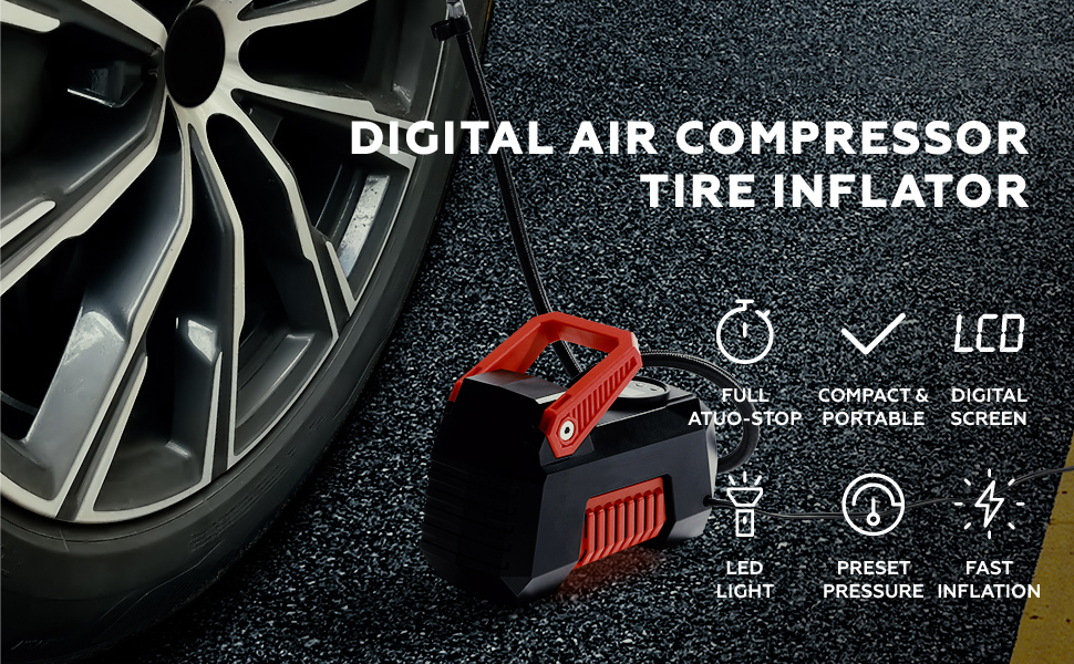 【多用途】制造带有应急LED灯的汽车轮胎充气机,确保您在黑暗中使用。包括4个喷嘴和额外的保险丝,以满足不同的充气需求。便携式压缩机可以通过schrader阀连接为汽车、摩托车的轮胎充气。通过配件喷嘴为气球、篮球、游泳圈、气垫、户外活动床垫充气。