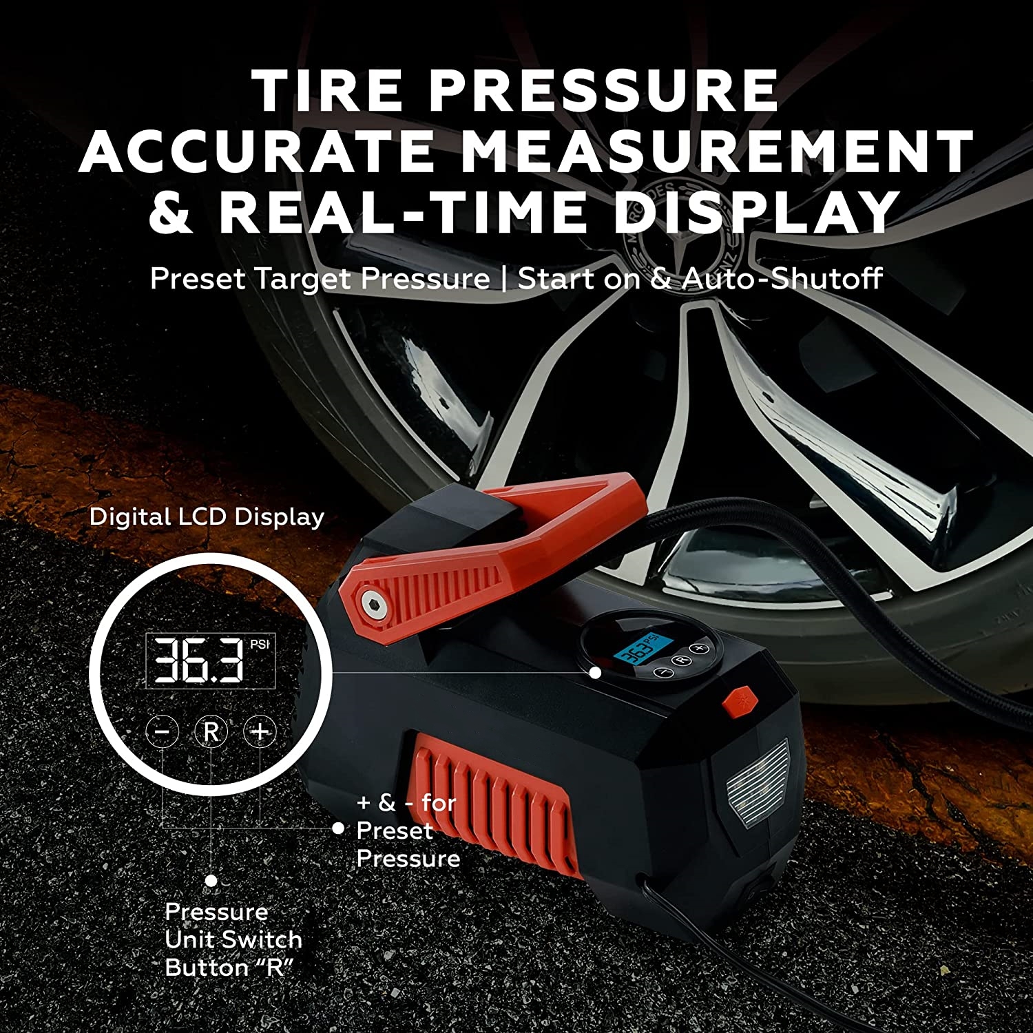 【易于操作和自动关闭】将便携式空气压缩机电源线连接到汽车的12V电源插座,然后将充气喷嘴插入轮胎阀,设置轮胎所需的压力,然后按下开关开始充气。当达到所需的轮胎压力时,空气压缩机泵将自动关闭。