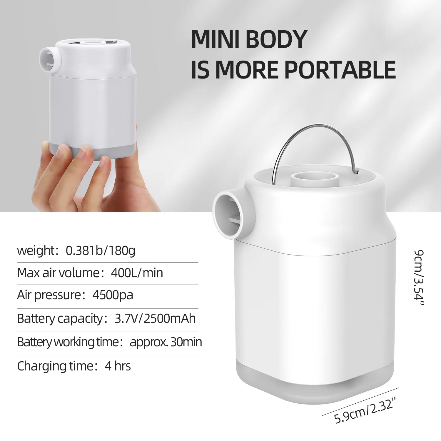 ★ 400升/分钟的风速和2.2千帕的气压,确保充气产品的快速充气/放气。迷你气泵能够为气垫床充气约3分钟,为救生筏充气约1分钟,为游泳圈充气约30秒。完美的吸气/放气功能,适用于户外露营、海滩、徒步旅行、储物袋